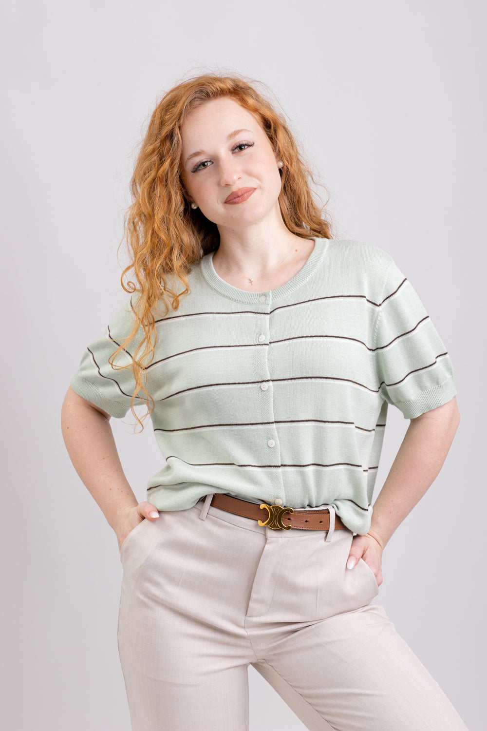 Top premium franțuzesc din 100% merinos extrafin, verde celadon. S-umeri 40, bust 100, L 56. M-umeri 42, bust 110, lungime 56.